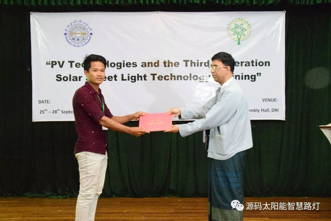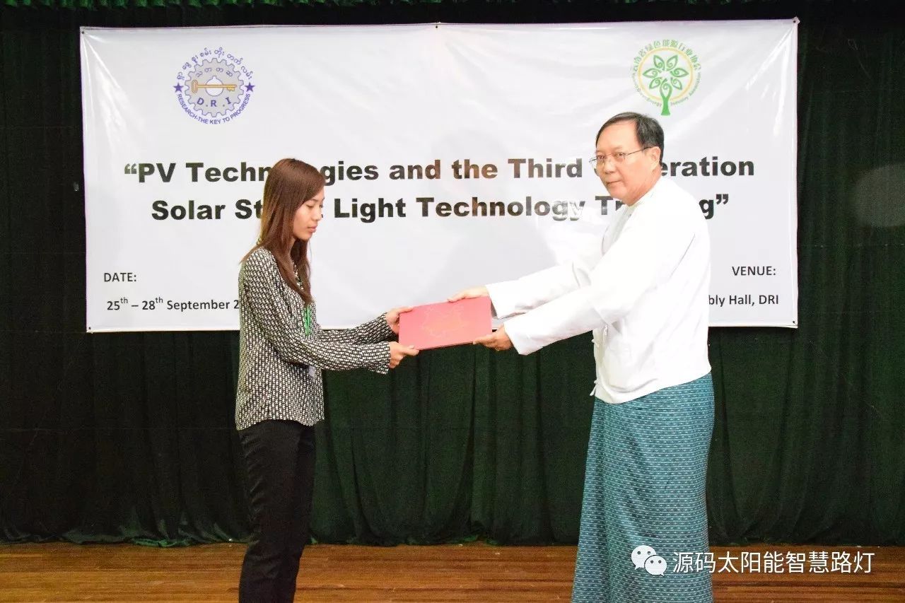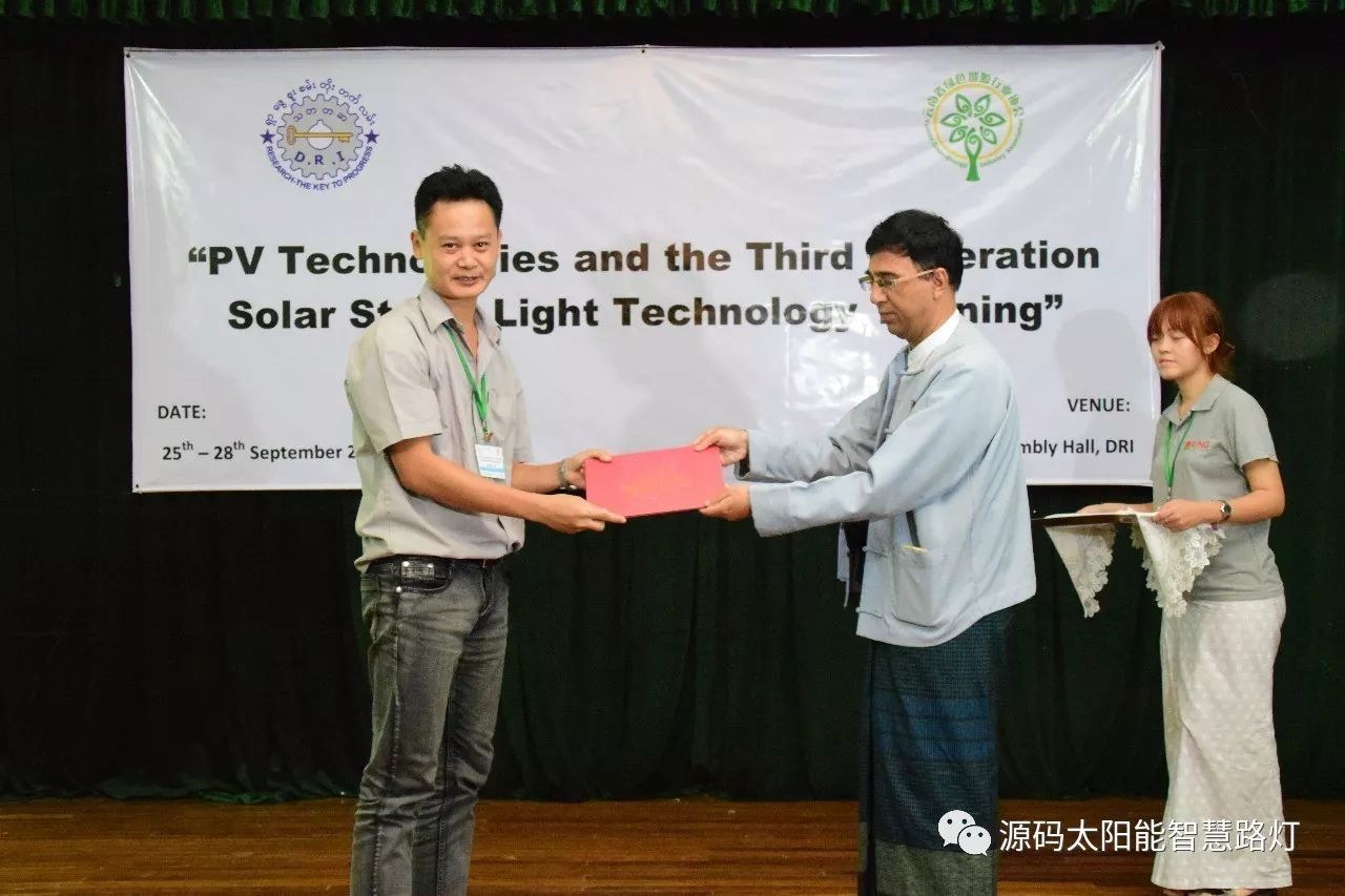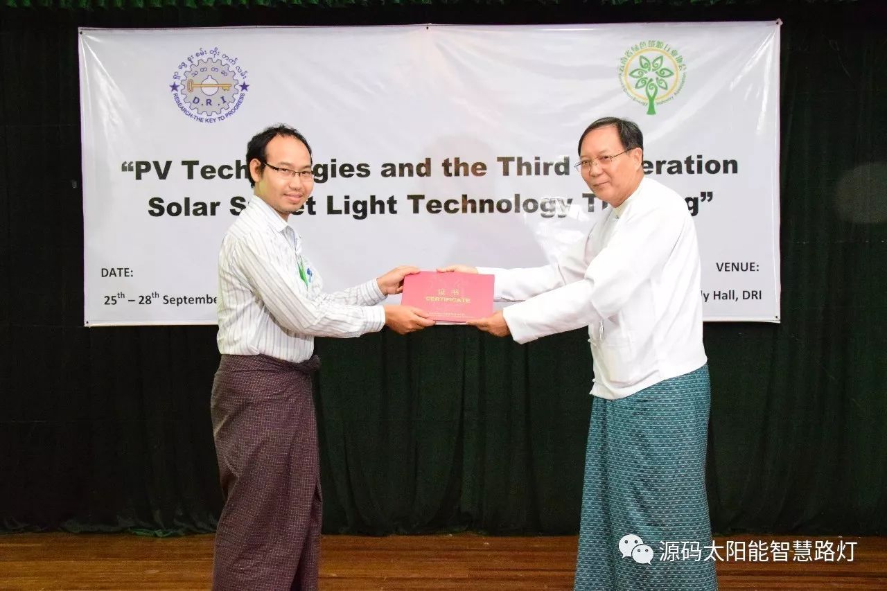 在培訓會議后,大家對此次的培訓綜合內(nèi)容及取得的效果進行了深入研討,參與此次培訓的能源部、政府部門的相關(guān)人員以及大學教授、企業(yè)代表都對此次培訓會的效果表示滿意,也希望以后能有更多的類似的培訓會,源碼也希望在以后的培訓中能夠給他們帶來更好的效果。研討會后,中國駐緬甸大使館領(lǐng)導對本次會議作了總結(jié):對本次培訓會議的培訓方云南省綠色能源行業(yè)協(xié)會以及源碼太陽能智慧路燈表示感謝,表示此次會議對雙方的技術(shù)交流學習以及中緬兩國友誼的加深都取到了十分良好的效果。接著緬甸教育部科技司司長則親自向所有通過考試的學員頒發(fā)了證書,在頒獎過程中,源碼也向緬甸教育部科技司捐贈了兩套太陽能智慧路燈。