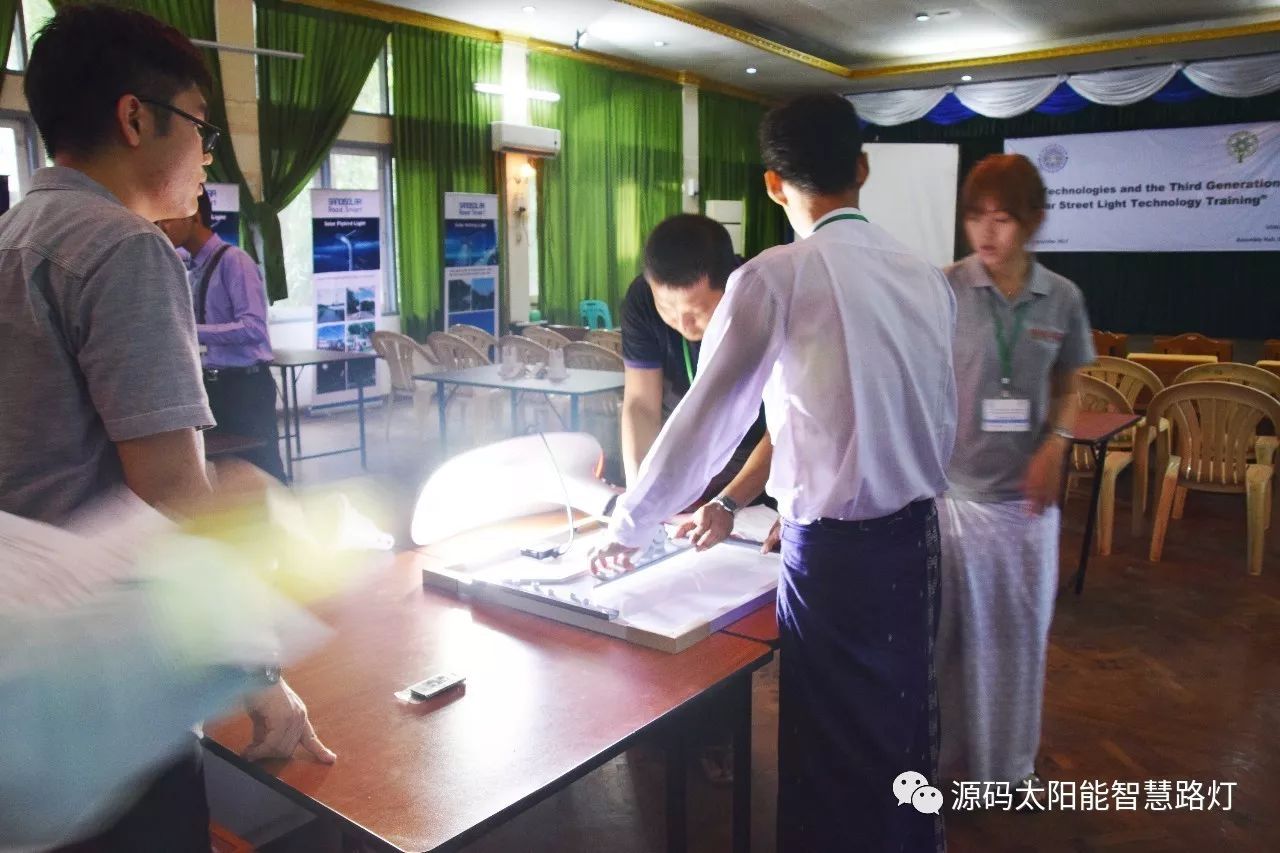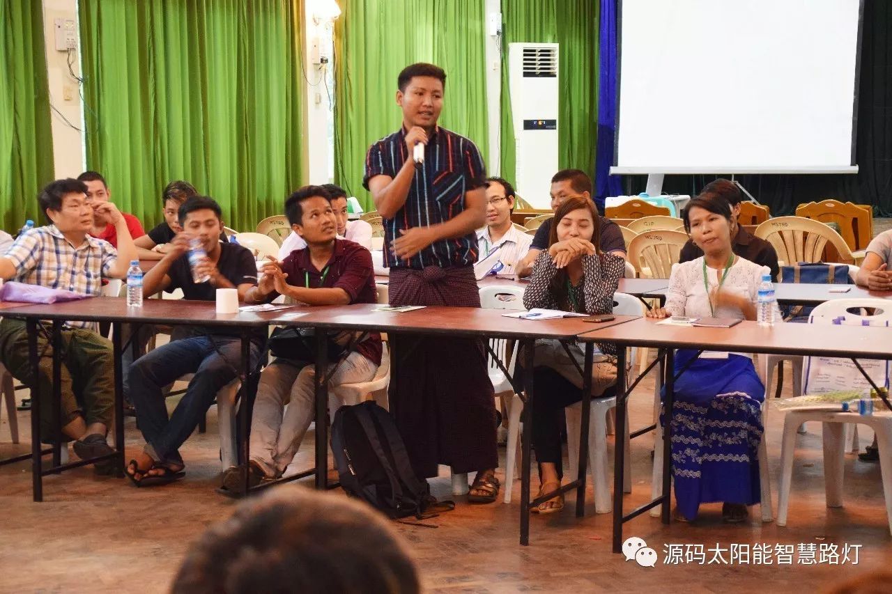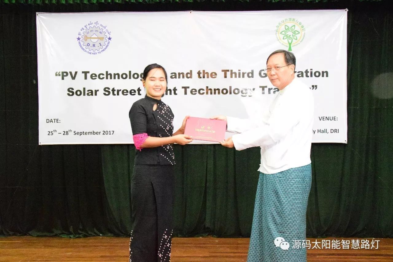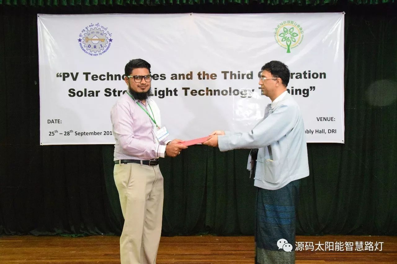 在培訓會議后,大家對此次的培訓綜合內(nèi)容及取得的效果進行了深入研討,參與此次培訓的能源部、政府部門的相關(guān)人員以及大學教授、企業(yè)代表都對此次培訓會的效果表示滿意,也希望以后能有更多的類似的培訓會,源碼也希望在以后的培訓中能夠給他們帶來更好的效果。研討會后,中國駐緬甸大使館領(lǐng)導對本次會議作了總結(jié):對本次培訓會議的培訓方云南省綠色能源行業(yè)協(xié)會以及源碼太陽能智慧路燈表示感謝,表示此次會議對雙方的技術(shù)交流學習以及中緬兩國友誼的加深都取到了十分良好的效果。接著緬甸教育部科技司司長則親自向所有通過考試的學員頒發(fā)了證書,在頒獎過程中,源碼也向緬甸教育部科技司捐贈了兩套太陽能智慧路燈。