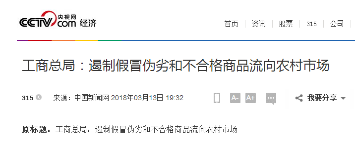 筆者發現,國家工商總局近日在官網公布《關于開展2018年紅盾質量維權行動的通知》?!锻ㄖ诽岢?,突出工作重點全面強化監管執法。各地工商和市場監管部門要圍繞當前商品和服務質量突出問題,著力加強商品和服務質量監督檢查力度?!锻ㄖ酚绕涮岬搅诉^往關注力度稍弱的農村市場,要嚴厲打擊偽劣商品違法行為,遏制假冒偽劣和不合格商品流向農村市場。
